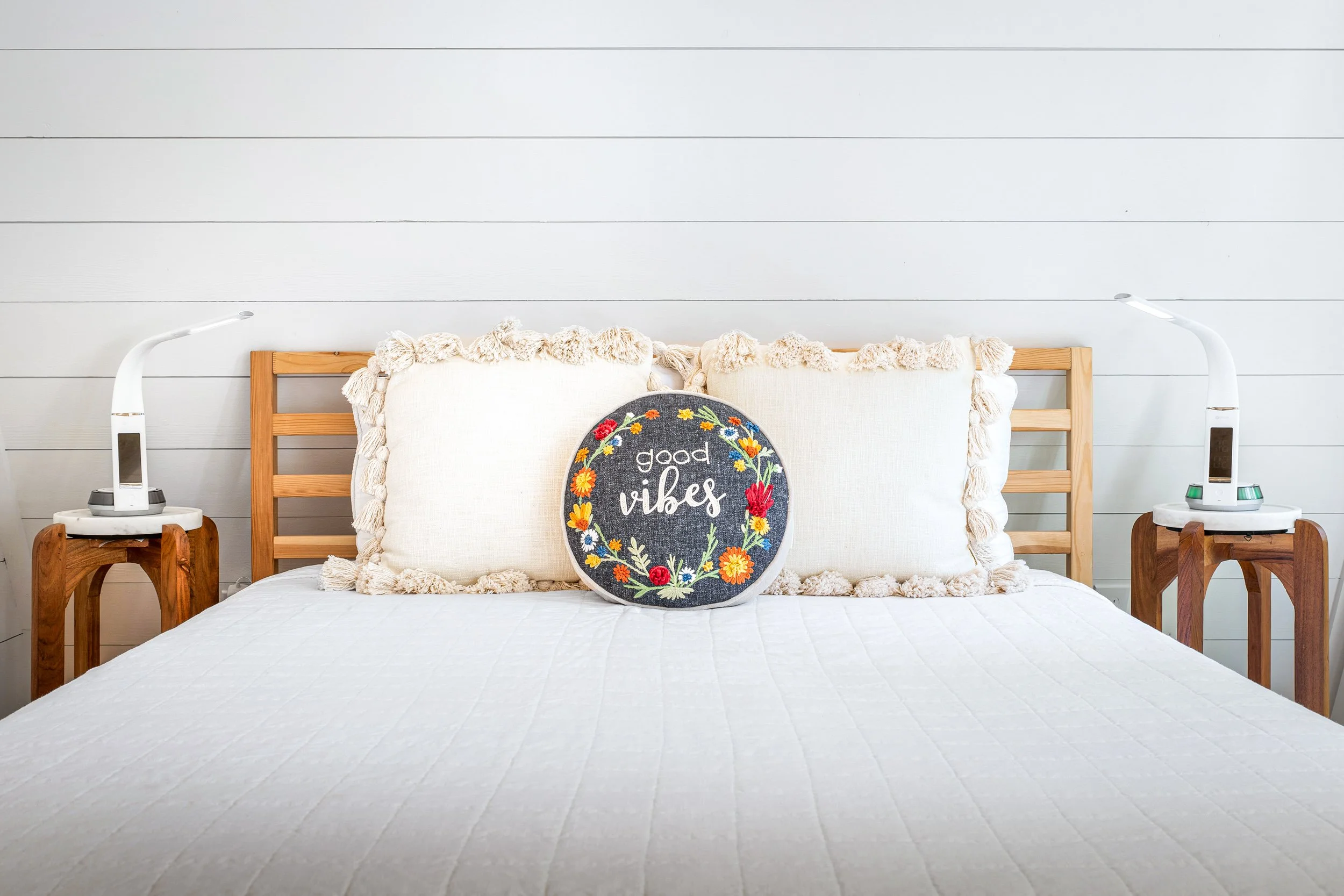 Photographing this A-frame outside of Charlottesville was a treat for the senses. The cabin, enveloped by the forest, stands out with its distinctive angular architecture and large glass facade that invites the outside in. The deck wraps around the structure, offering a seamless transition to nature. Inside, the space is a marvel of design with high ceilings, exposed beams, and a loft overlooking the main living area. The intricate herringbone pattern on the wood floor, the modern kitchen, and the tasteful decor all contribute to a feeling of rustic luxury.
